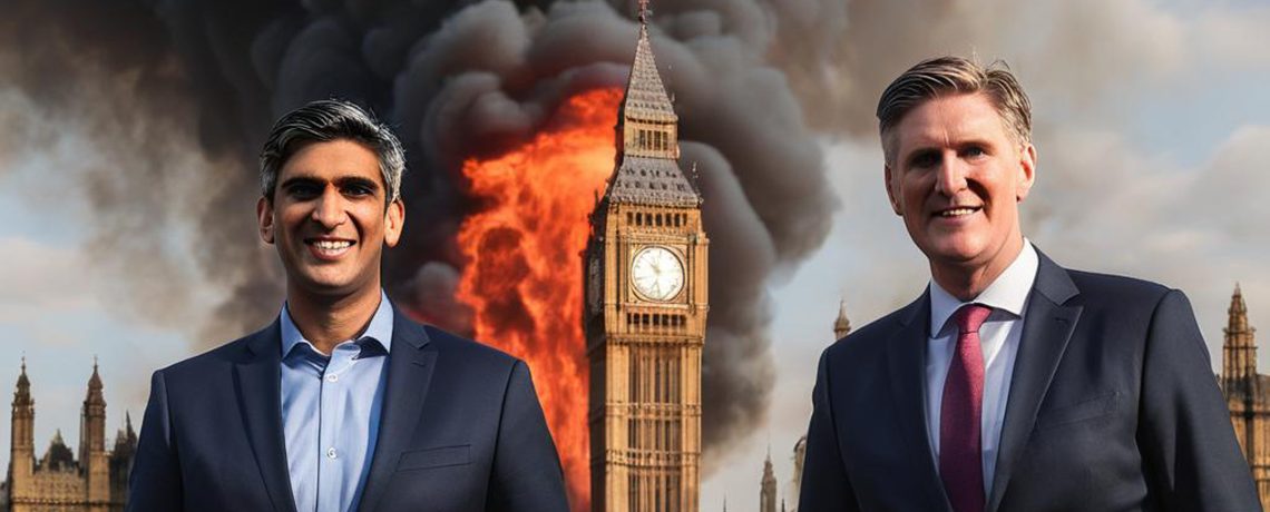 Pictured: Prime minister Rishi Sunak and Labour leader Keir Starmer in front of a burning Houses of Parliament. This AI-generated image is not designed to mislead – but more convincing examples could sway voters