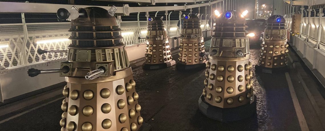 Pictured: Daleks on the Clifton Suspension Bridge from Doctor Who: Revolution of the Daleks (2021)