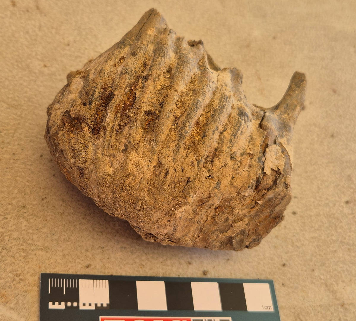 This year, the dig has found a bull mammoth tusk, a mammoth tooth (pictured), bones from mammoths, bison, rhino, and giant horse and deer dating from 210,000 to 220,000 years ago, along with Jurassic material including ammonites, bivalves are molluscs, which are approximately 165 million years old.