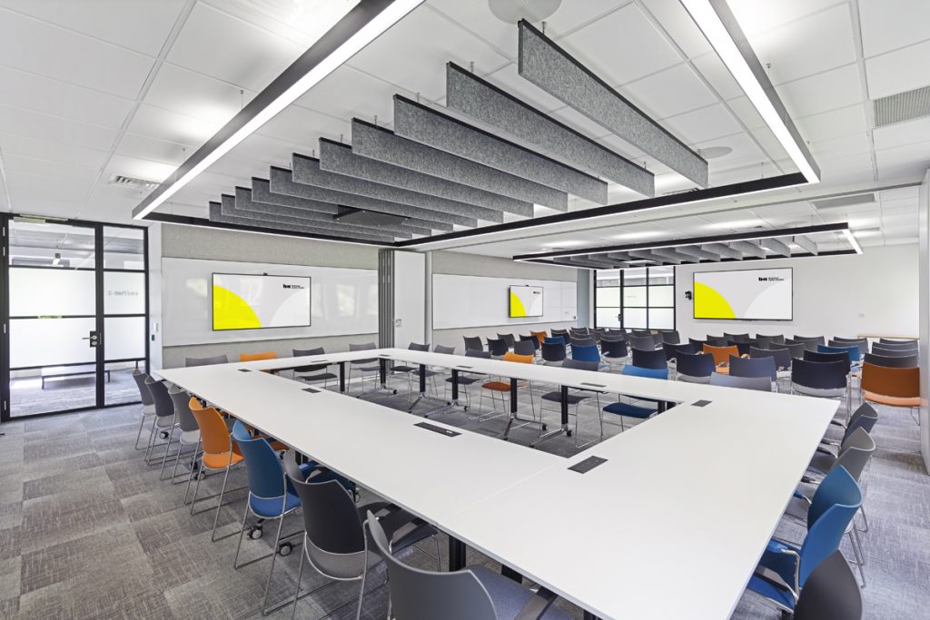 The conference room can seat up to 140 people theatre-style, 80 around tables of eight for meetings, or 64 in a classroom style. The room can be divided into three, each with a 60-inch HD screen – ideal for presentations or hybrid meetings.